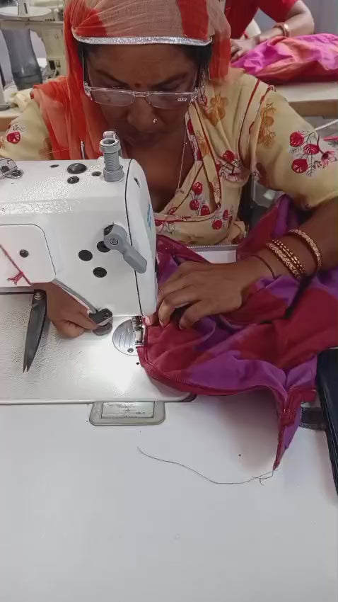 This cushion cover is lovingly handcrafted by the artisans of Saheli Women in Rajasthan, India. The social enterprise provides fair wages, safe working conditions, and opportunities for women in a rural community.